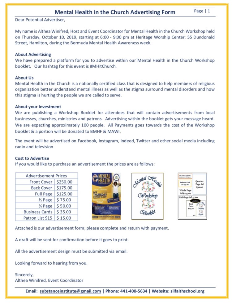 Event Coordinator for Mental Health in the Church (MHitChurch)Workshop held on Thursday, October 10, 2019, starting at 6:00 – 9:00 pm during the Bermuda Mental Health Awareness week.
